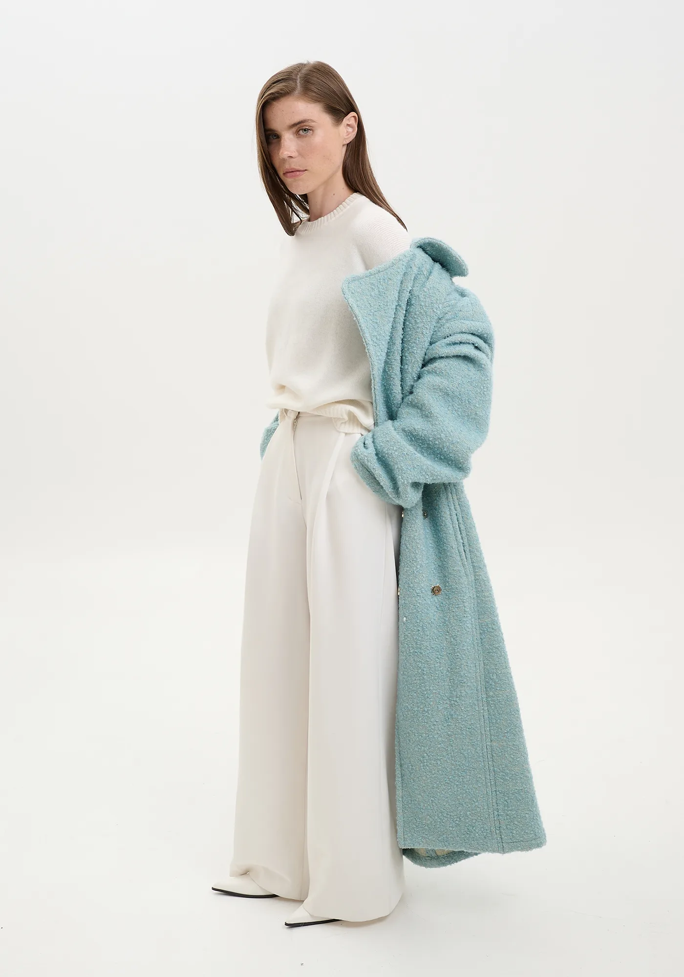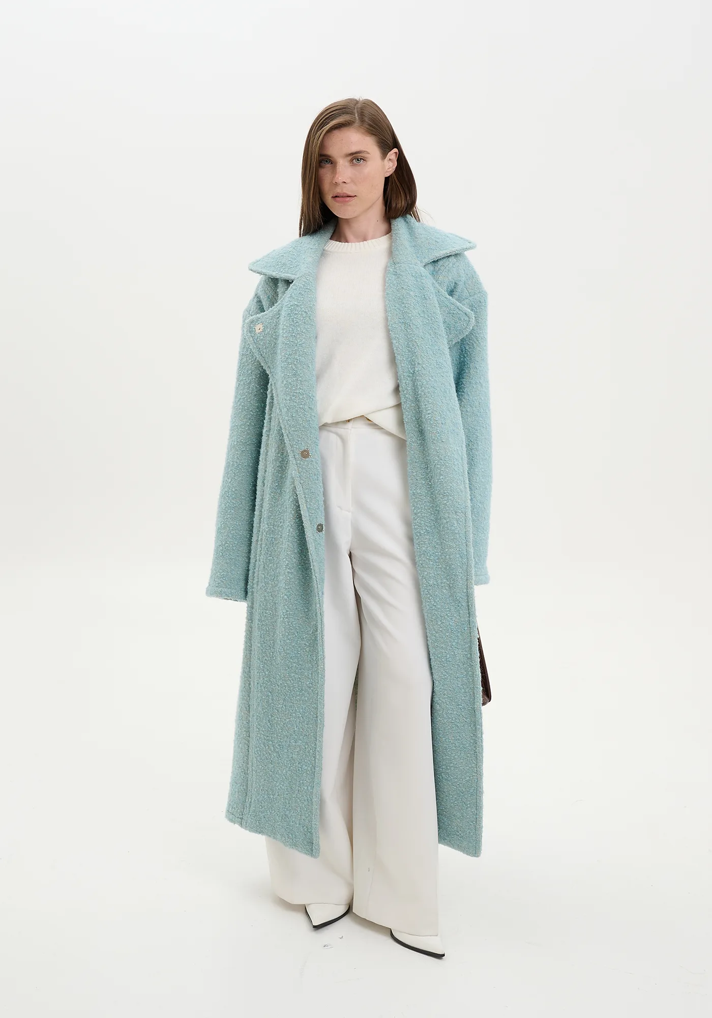 Пальто Cozy макси из итальянской шерсти мятного цвета — стильное и изысканное дополнение вашего гардероба. Плотная фактурная ткань премиального качества обеспечивает тепло и комфорт, а благородный мятный оттенок придает свежести и элегантности образу. Внутренний контрастный шов и закрытые премиальные швы подчёркивают внимание к деталям и высокое качество изделия. Удлиненный силуэт делает пальто универсальным выбором для сезона осень-зима, подчеркивая утонченный стиль и современный вкус.